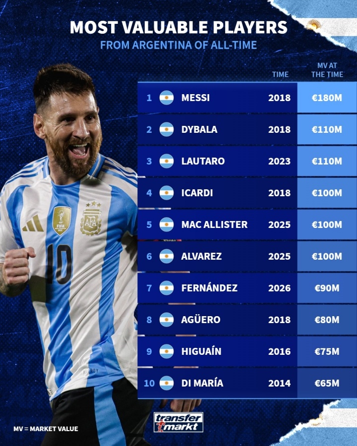 开云-阿根廷历史身价排行:梅西1.8亿欧第一,恩佐第7迪马利亚第10
